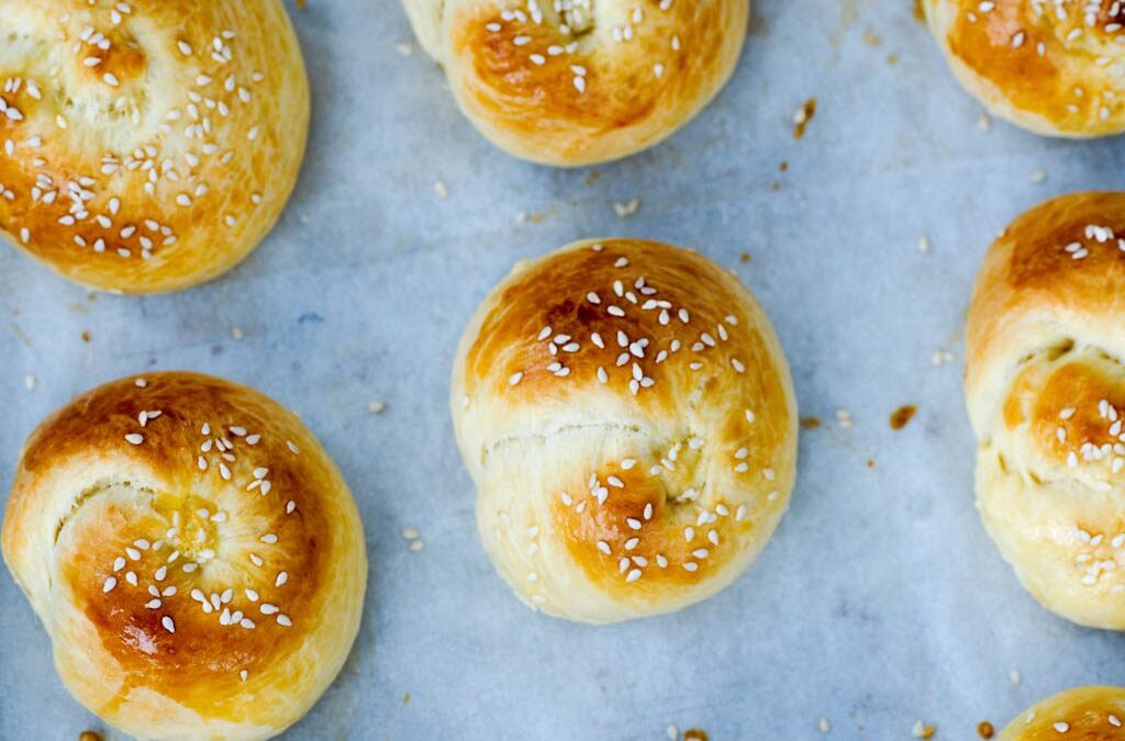 13. Beat 1 egg with a splash of water or milk for the egg wash. Brush the tops and sides of the choreg with egg wash, and then sprinkle with sesame seeds. Bake for 20-25 minutes, rotating once, or until tops just turn brown.